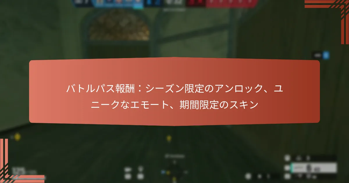 トム・クランシーのレインボーシックス シージ バトルパスにおける季節限定の特典とは、特定のシーズン中にバトルパスを進めることでプレイヤーが獲得できる独占的な報酬を指します。これらの特典には、ユニークなスキン、エモート、その他のコスメティックアイテムが含まれ、ゲーム体験を向上させ、プレイヤーの成果を示します。